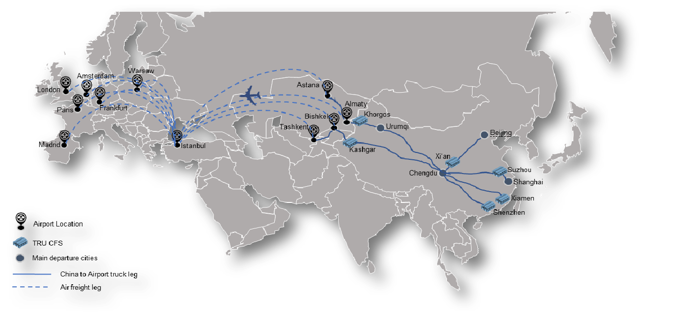 中国主要城市 – 苏州 / 深圳(集装箱货运站)– 边境(霍尔果斯或喀什)– 口岸(空运)– 中亚/高加索/非洲/欧洲