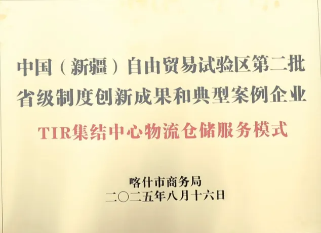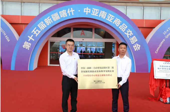(4)2025年8月16日,就在第十五届新疆喀什·中亚南亚商品交易会举办期间(2025年8月15日至19日),由喀什磐炬TIR集结中心主办、喀什市人民政府、深圳支援新疆工作前方指挥部、中国道路运输协会联合支持的喀什便利运输服务中心在喀什国际会展中心成功揭牌。与此同时,当天喀什磐炬TIR集结中心成功荣获了《中国(新疆)自由贸易试验区第二批省级制度创新典型案例企业》牌匾。